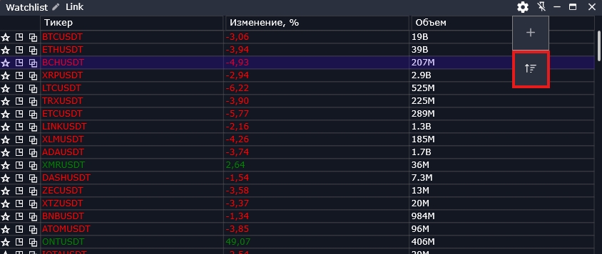 The list is automatically sorted by the Change, % or Volume columns. To enable this, click on the appropriate icon in the menu.